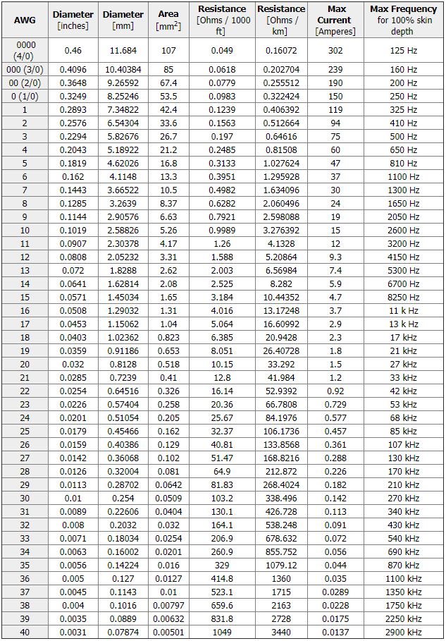 American Wire Gauge (AWG) Sizes and Properties Chart / Table